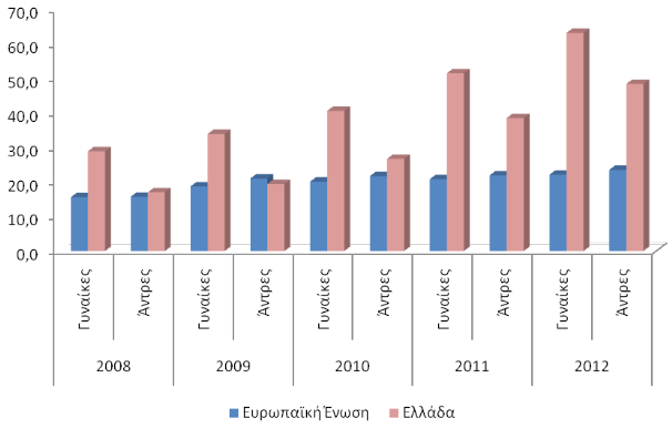 Διάγραμμα 2. Ανεργία νέων αντρών και γυναικών στην Ελλάδα και την Ευρωπαϊκή Ένωση (2008-2012, %)