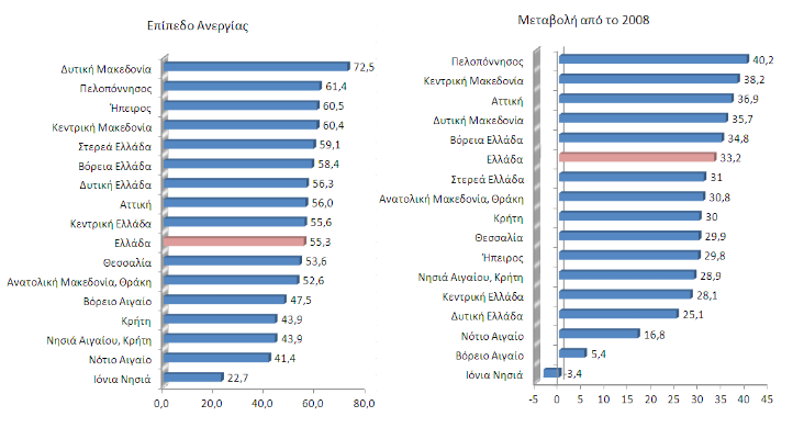 Σημείωση: Στο δεύτερο τμήμα του διαγράμματος λόγω έλλειψης δεδομένων, τα ποσοστά για τα Ιόνια Νησιά και το Ν. Αιγαίο αφορούν στην αύξηση της ανεργίας από το 2009 και για το Βόρειο Αιγαίο από το 2011.