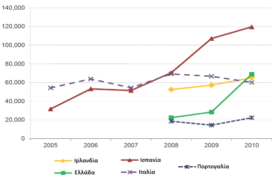 Γεγονός είναι πως, τα τελευταία χρόνια, η μετανάστευση από τις χώρες που έχουν πληγεί εντονότερα από την κρίση έχει αυξηθεί σημαντικά. Τη μεγαλύτερη αύξηση κατέγραψαν η Ελλάδα και η Ισπανία. Στην Ελλάδα οι εκροές (ημεδαπών και πολιτών άλλων ευρωπαϊκών χωρών) αυξήθηκαν κατά 207% (από 22.402 σε 68.874) μεταξύ 2008-2010. Την ίδια περίοδο η μετανάστευση από την Ισπανία αυξήθηκε κατά 70%, από 70.538 σε 119.579 (Διάγραμμα 1). Στη Γερμανία, αντίστροφα, η μετανάστευση μειώθηκε κατά 321.136 (64%) τα δύο αυτά χρόνια. Η μετανάστευση των νότιων χωρών θα μπορούσε να κατευθύνεται προς χώρες εκτός της ΕΕ, ωστόσο συνδυαστικά με άλλα γεγονότα (αύξηση του αριθμού των πολιτών νότιων χωρών που κατοικούν σε άλλες χώρες της ΕΕ, χώρες προέλευσης των εισροών στη Γερμανία) αποτελεί απόδειξη ότι η κρίση συνέβαλε στην ενίσχυση της εργασιακής κινητικότητας εντός της ΕΕ.
