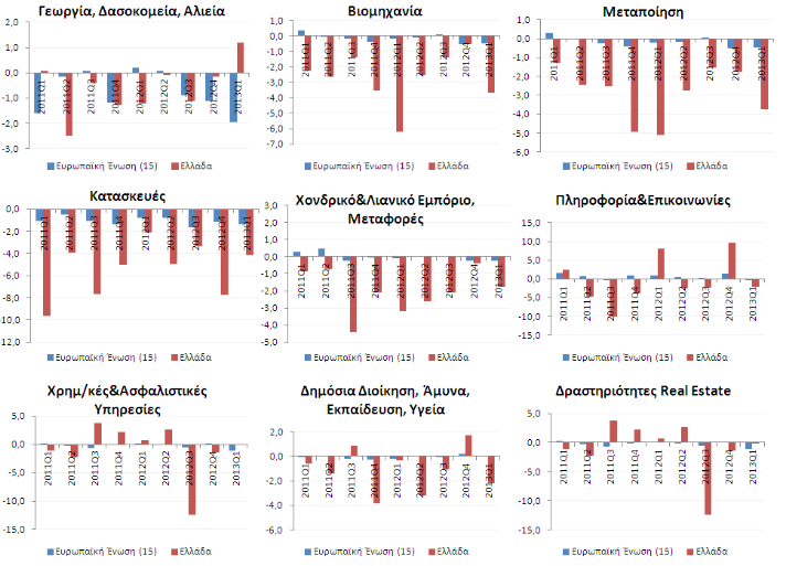 Στην Ελλάδα, η συνολική απασχόληση για το εν λόγω χρονικό διάστημα συρρικνώθηκε κατά 16,8%, ποσοστό ενδεικτικό του μεγέθους καταστολής της οικονομικής δραστηριότητας. Οι τομείς που επλήγησαν εντονότερα από πλευράς απασχόλησης είναι ο κατασκευαστικός (-48,6%), ο τομέας διαχείρισης ακίνητης περιουσίας (-34,5%), η μεταποίηση (-26,1%), η βιομηχανία (-24,2%) και ο τομέας του χονδρικού και λιανικού εμπορίου και των μεταφορών (-18,1%). Στην πλειοψηφία των επιμέρους οικονομικών τομέων, η απασχόληση εξακολούθησε να μειώνεται και το πρώτο τρίμηνο του 2013, με τη μεγαλύτερη πτώση να καταγράφεται στον τομέα του realestate (-12,5%). Αντίθετα, στασιμότητα σημειώθηκε ουσιαστικά στον κλάδο των χρηματοοικονομικών και ασφαλιστικών υπηρεσιών (-0,1%), ενώ ο κλάδος της γεωργίας, αλιείας και δασοκομίας ήταν ο μοναδικός στον οποίο καταγράφηκε ενίσχυση του αριθμού των απασχολουμένων.
