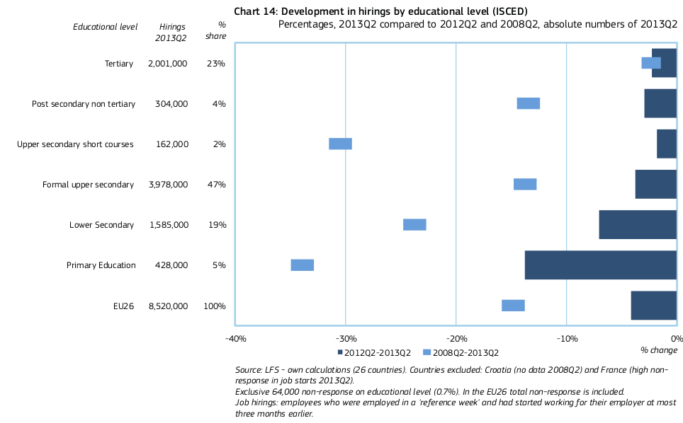 Ξεκινώντας από το δεύτερο, η σύγκριση των στοιχείων του δεύτερου τετάρτου του 2013 με τα στοιχεία του αντίστοιχου τετάρτου του 2012 φανερώνει πως για πρώτη φορά, από το τελευταίο τέταρτο του 2009, υπάρχει πτώση ως προς τις προσλήψεις ανεξαρτήτως εκπαιδευτικής βαθμίδας. Η πτώση αυτή είναι μεγαλύτερη στις χαμηλότερες βαθμίδες εκπαίδευσης (14% και 8% στις δύο πρώτες βαθμίδες, αντίστοιχα), ενώ στις ανώτερες βαθμίδες κυμαίνεται μεταξύ 2% και 3%(πατήστε εδω για να δείτε το διάγραμμα).