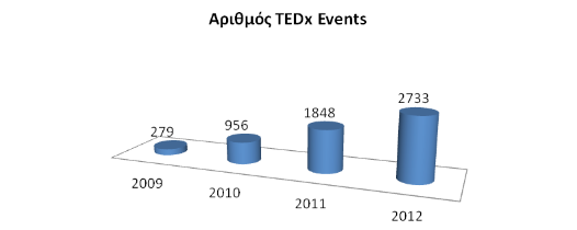 Από το 2006 και έπειτα οι ομιλίες που παρουσιάζονται στα παγκόσμια συνέδρια TED είναι προσβάσιμες από το διαδίκτυο, ενώ παράλληλα με τα συνέδρια TED δημιουργήθηκε το πρόγραμμα TEDx (2009), στο οποίο διοργανωτές απ’ όλο τον κόσμο -έπειτα από άδεια από το TED- οργανώνουν ένα TEDx Event στην πόλη τους. Οι ομιλίες όλων των TEDx Events βιντεοσκοπούνται και ανεβαίνουν στο επίσημο κανάλι του TEDx στο Youtube και στα επίσημα sites των TEDx Events, απ’ όπου αναπαράγονται στα social media. Το αποτέλεσμα αυτής της εξωστρέφειας είναι ότι το TED δεν είναι πλέον ένας διοργανωτής συνεδρίων αλλά ένα παγκόσμιο φαινόμενο με έσοδα που ξεπερνούν τα 45 εκατομμύρια δολάρια ενώ οι εκδηλώσεις TEDx που οργανώνονται αυξάνονται με γεωμετρική πρόοδο χρόνο με το χρόνο (Διάγραμμα 1).