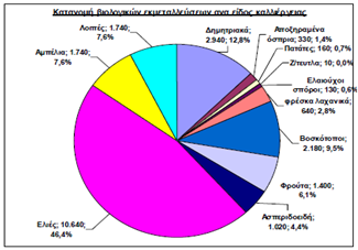 Στην Ελλάδα, σύμφωνα με τα στοιχεία του Υπουργείου Αγροτικής Ανάπτυξης και Τροφίμων, στο τέλος του 2011 δραστηριοποιούνταν στον κλάδο 18.415 βιοκαλλιεργητές, 1.506 μεταποιητές, 5 εισαγωγείς και 27 χονδρέμποροι-διακινητές. Όπως προκύπτει από τον πίνακα που παρατίθεται, η πλειοψηφία των εκμεταλλεύσεων (46,4% ή 10.640 εκμεταλλεύσεις), αφορά στην καλλιέργεια ελιάς. Το 21% των βιολογικών εκμεταλλεύσεων βρίσκονται στη Δυτική Ελλάδα, το 16% στη Πελοπόννησο, το 12% στο Β. Αιγαίο, το 11% στη Θεσσαλία, το 10,3% στην Κεντρική Μακεδονία, το 7,9% στην Κρήτη και ακολουθούν οι λοιπές περιοχές της Ελλάδας.