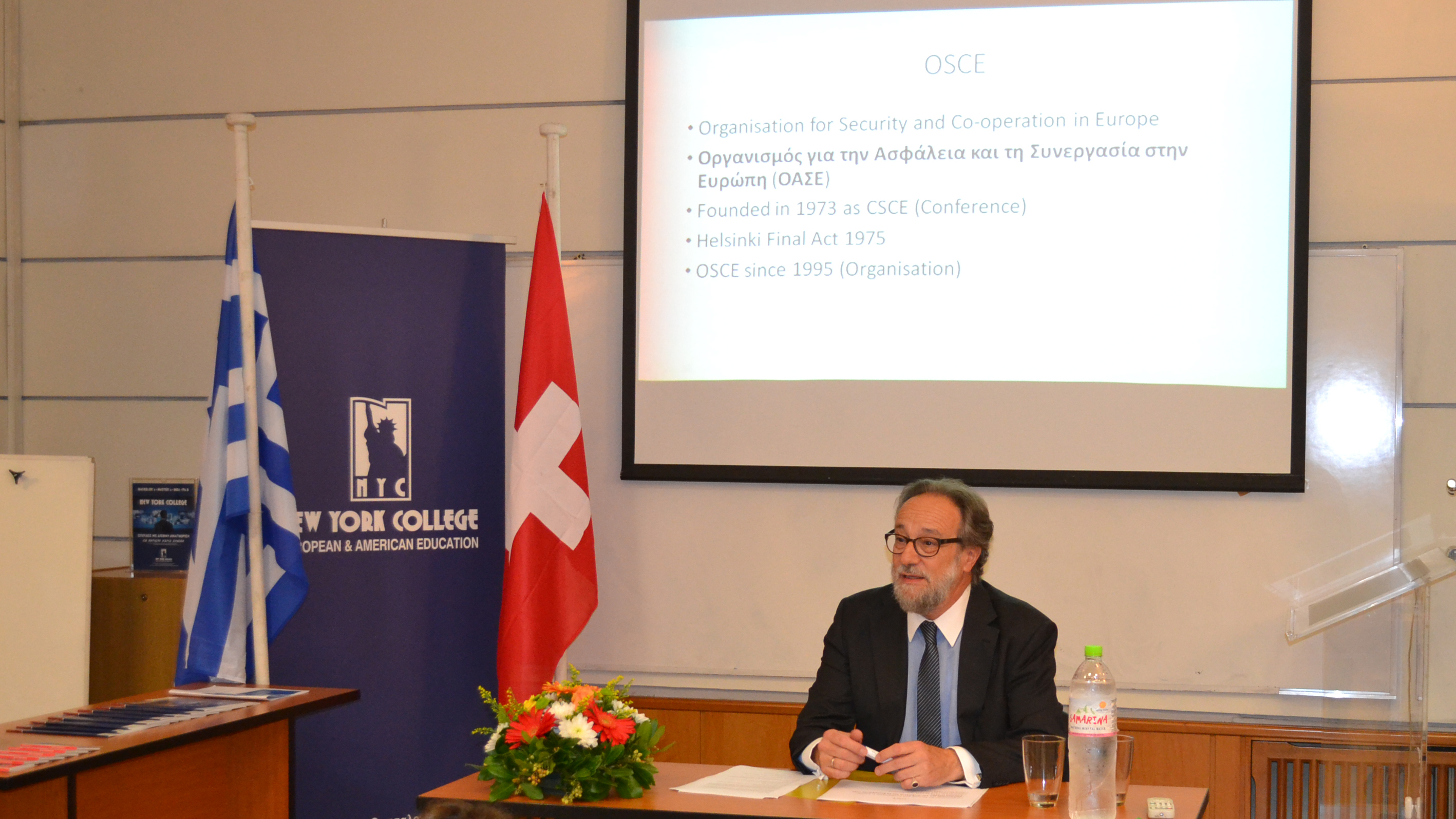 Την Πέμπτη 6 Νοεμβρίου, η Α.Ε. ο Πρέσβης της Ελβετίας κ. Lorenzo Amberg, έδωσε διάλεξη στο New York College στο πλαίσιο του πρωτοποριακού κύκλου διαλέξεων “Το Ακαδημαϊκό Βήμα των Πρεσβευτών”, με θέμα την ιστορία και τον ρόλο του Οργανισμού για την Ασφάλεια και Συνεργασία στην Ευρώπη {ΟSCE}, καθώς και τη συμβολή της Ελβετίας στη διαχείριση διεθνών κρίσεων και την επίλυση διεθνών διαφορών. O Πρέσβης επαίνεσε ιδιαίτερα τον ευεργετικό ρόλο του Ιωάννη Καποδίστρια στη συνταγματική ανάπτυξη της Ελβετίας. Στη συνέχεια της διάλεξης, οι δεκάδες φοιτητές διαφόρων εθνικοτήτων είχαν την ευκαιρία να διατυπώσουν ερωτήσεις σχετικά με τα εξόχως ενδιαφέροντα θέματα που προέκυψαν από τη διάλεξη.