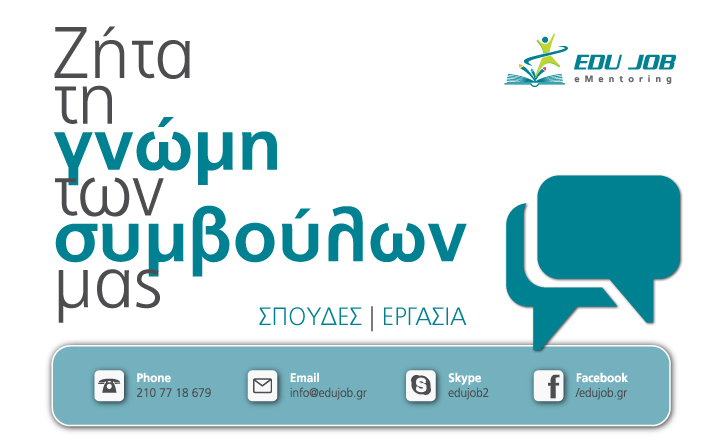 Όπου θα συναντήσεις την ομάδα των ψυχολόγων και των συμβούλων της EduJob και θα μιλήσεις μαζί τους εντελώς δωρεάν για τις σκέψεις σας και τα ερωτηματικά σας σε θέματα σπουδών- εργασίας – επαγγελμάτων.