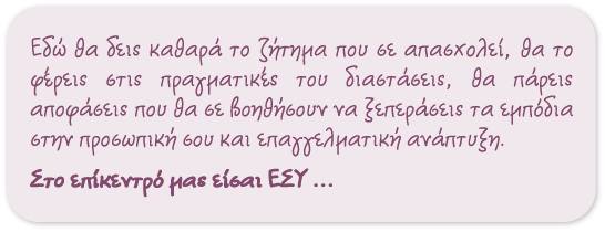 Εδώ θα δεις καθαρά το ζήτημα που σε απασχολεί, θα το φέρεις στις πραγματικές του διαστάσεις, θα πάρεις αποφάσεις που θα σε βοηθήσουν να ξεπεράσεις τα εμπόδια στην προσωπική σου και επαγγελματική ανάπτυξη.