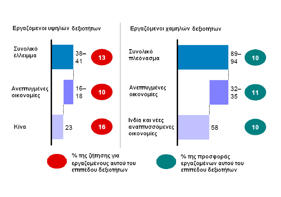 Σύμφωνα με έρευνα της McKinsey, η έλλειψη εργατικού δυναμικού υψηλών δεξιοτήτων σε παγκόσμιο επίπεδο αναμένεται μέχρι το 2020 να αγγίξει το 13% της ζήτησης εργαζομένων αυτής της κατηγορίας, δηλαδή τα άτομα με υψηλές δεξιότητες θα είναι περίπου 38 με 40 εκατομμύρια λιγότερα από αυτά που θα έχει ανάγκη η αγορά (Διάγραμμα 1). Στις ανεπτυγμένες οικονομίες το έλλειμμα προσδιορίζεται σε 16 με 18 εκατομμύρια. Αντίθετα, το εργατικό δυναμικό χαμηλής ειδίκευσης σε παγκόσμιο επίπεδο αναμένεται να είναι κατά 10% περισσότερο από το ζητούμενο, ενώ αριθμητικά εκτιμάται σε 90 με 95 εκατομμύρια άτομα. Στις ανεπτυγμένες οικονομίες το πλεόνασμα εργαζομένων με χαμηλές δεξιότητες αναμένεται να ανέλθει σε 32 με 35 εκατομμύρια.
