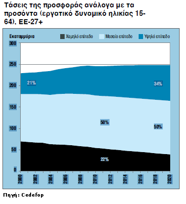 Είναι γεγονός ότι εξαιτίας της οικονομικής κρίσης, η ζήτηση, προς το παρόν τουλάχιστον, υστερεί έναντι της προσφοράς. Ως αποτέλεσμα αυξάνεται ο ανταγωνισμός από πλευράς των εργαζομένων για τις διαθέσιμες θέσεις εργασίας. Αυτό ωθεί αρκετούς εργαζομένους να αναλάβουν, έστω και βραχυπρόθεσμα, δουλειές κατώτερες των προσόντων τους. Υπό αυτές τις συνθήκες πιο εύκολα αποδέχεται ένας εργαζόμενος μια θέση εργασίας για την οποία έχει παραπάνω από τα ενδεδειγμένα προσόντα, ή, έστω και περιστασιακά, μία θέση μερικής απασχόλησης ή άλλη που προσφέρει λιγότερο ευνοϊκές συνθήκες, π.χ. με χαμηλό μισθό. Ως αποτέλεσμα, όσοι έχουν περισσότερα προσόντα εκτοπίζουν ενίοτε τα άτομα με χαμηλή εξειδίκευση από τις θέσεις εργασίας που κανονικά θα κατείχαν. Εάν αυτό το φαινόμενο συνεχιστεί, ενδέχεται να μειώσει την παραγωγικότητα, καθώς τα άτομα αποθαρρύνονται στην εργασία τους και οι δεξιότητές τους καθίστανται απαρχαιωμένες, καθώς δεν χρησιμοποιούνται και δεν εξελίσσονται. Χαρακτηριστικό αποτελεί ότι ήδη περίπου 6,4 εκατομμύρια Ευρωπαίοι (ένας στους τρεις) εργάζονται σε δουλειά κατώτερη των τυπικών τους προσόντων. Ωστόσο, οι Ευρωπαίοι θα εξακολουθήσουν να επιμένουν στην τριτοβάθμια εκπαίδευση. Αυτό μαρτυρά η πρόβλεψη του Cedefop βάσει της οποίας ο αριθμός των ατόμων με δεξιότητες πανεπιστημιακού επιπέδου θα εξακολουθήσει να αυξάνεται για όλες τις ηλικίες και αναμένεται, το 2020, να διαμορφωθεί στο 34% περίπου του συνολικού εργατικού δυναμικού.