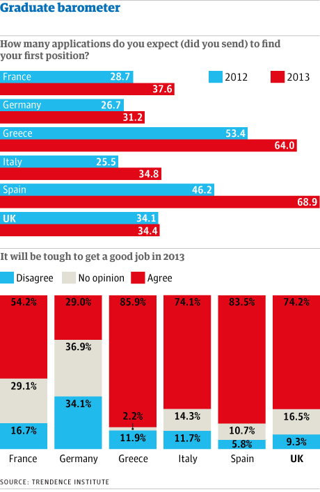 Ενδιαφέρον παρουσιάζουν τα ευρήματα, που παρατίθενται στους πίνακες, σχετικά με δύο ερωτήσεις που τέθηκαν. Η πρώτη αφορά τον αριθμό των αιτήσεων που έκαναν οι απόφοιτοι προκειμένου να βρουν την πρώτη τους δουλειά (πρώτος πίνακας), ενώ η δεύτερη αφορά το πόσο δύσκολο θεωρούν οι απόφοιτοι να βουν δουλειά το 2013 (δεύτερος πίνακας). Στον δεύτερο πίνακα, με γαλάζιο χρώμα δηλώνεται το «διαφωνώ», με γκρι το «δεν ξέρω» και με κόκκινο το «συμφωνώ».