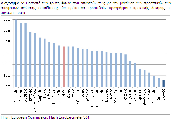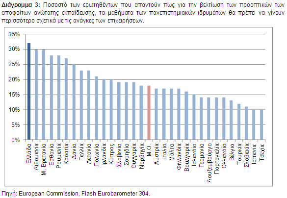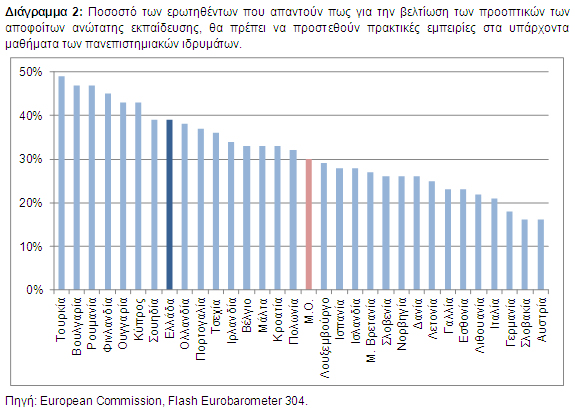Οι έλληνες εργοδότες απαντούν θετικά σε σημαντικά μεγαλύτερο βαθμό, σε σχέση με τον ευρωπαϊκό μέσο όρο, στην ερώτηση για το εάν θα πρέπει να προστεθούν πρακτικές εμπειρίες στα υπάρχοντα μαθήματα των προγραμμάτων σπουδών των ελληνικών πανεπιστημίων. Παράλληλα, άνω του 30% των ερωτηθέντων στην Ελλάδα θεωρεί πως τα μαθήματα θα πρέπει να γίνουν περισσότερο σχετικά με τις ανάγκες των επιχειρήσεων, ποσοστό που είναι το υψηλότερο μεταξύ των χωρών που μετέχουν στην έρευνα.