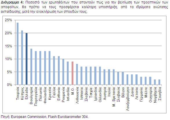 Τέλος, ένα ποσοστό της τάξης του 20% (που αποτελεί από τα υψηλότερα μεταξύ των χωρών που συμμετέχουν στην έρευνα) θεωρεί πως θα πρέπει να δοθεί μεγαλύτερη σημασία στην υποστήριξη των πτυχιούχων μετά την ολοκλήρωση των σπουδών τους.