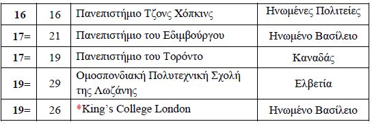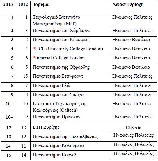 Το ίδρυμα της χώρας που βρίσκεται στην κορυφή της κατάταξης φέτος για δεύτερη συνεχή χρονιά είναι το Αριστοτέλειο Πανεπιστήμιο Θεσσαλονίκης (θέση 471-480), που παρουσιάζει αύξηση από τη θέση 451-500 όπου βρισκόταν το 2012. Το Πανεπιστήμιο της Κρήτης είναι το δεύτερο καλύτερο ίδρυμα της χώρας στη θέση 491-500, και ακολουθεί το Εθνικό και Καποδιστριακό Πανεπιστήμιο Αθηνών και το Εθνικό Μετσόβιο Πολυτεχνείο (και τα δύο στη θέση 501-550). Το Πανεπιστήμιο Πατρών βρίσκεται στη θέση 601-650 ενώ το Οικονομικό Πανεπιστήμιο Αθηνών είναι στη θέση της κλίμακας + 701.