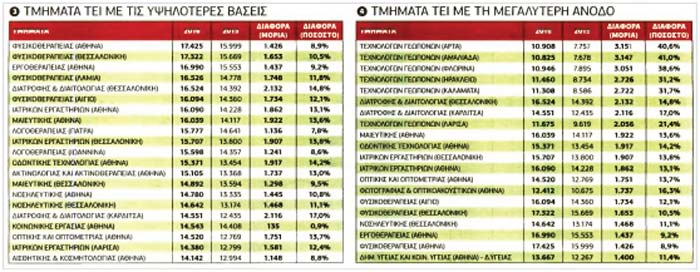 • Η άνοδος στον κλάδο υγείας είναι σαρωτική. Δεν περιορίζεται στα ΤΕΙ. Αφορά όλα τα σχετικά τμήματα και στα Πανεπιστήμια (Νοσηλευτική Αθήνας, άνοδος κατά 1.459 μόρια από 16.210 σε 17.669).
